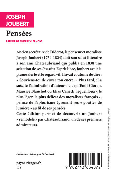 Ancien secrétaire de Diderot, le penseur et moraliste Joseph Joubert (1754-1824) doit son salut littéraire à son ami Chateaubriand, lequel publia en 1838 une sélection de ses «Pensées». Esprit libre, Joubert avait la plume alerte et le regard vif. Il avait coutume de dire : « Souviens-toi de cuver ton encre. » Plus tard, il a suscité l'admiration d'auteurs tels qu'Emil Cioran, Maurice Blanchot ou Elias Canetti, lequel loua « le plus léger, le plus délicat des moralistes français », prince de l'aphorisme égrenant ses « gouttes de lumière » au fil de ses pensées.
