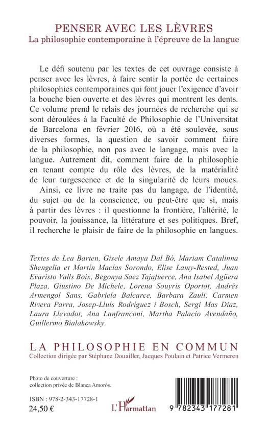Notre défi consiste à penser avec les lèvres, à faire sentir la portée de certaines philosophies contemporaines qui font jouer l'exigence d'avoir la bouche bien ouverte et des lèvres qui montrent les dents. Comment faire de la philosophie, non pas avec le langage, mais avec la langue, autrement dit avec sa matérialité et sa singularité ? Ce livre ne traite pas du langage, de l'identité ou du sujet, ou peut-être que si, mais à partir des lèvres : il questionne la frontière, l'altérité, le pouvoir, la jouissance, la littérature et ses politiques. Bref, il recherche le plaisir de faire de la philosophie en langues.