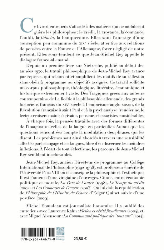 Ce livre d'entretiens s'attarde a des matieres qui mobilisent peu les philosophes: le credit, la croyance, la confiance, l'oubli, la fiducia, la banqueroute. Elles sont l'ancrage d'une conception peu commune du XIX siecle, attentive aux relations de pensees entre la France et l'Allemagne, foyer neglige de notre present. C'est ce qui sous-tend ce que Jean-Michel Rey appelle le dialogue franco-allemand. Depuis un premier livre sur Nietzsche au debut des annees 70, le travail philosophique de Jean-Michel Rey avance par reprises qui relancent et amplifient les motifs de sa reflexion sans obeir a un programme ou des objectifs assignes. Celle-ci prend corps au sein d'un corpus philosophique, theologique, litteraire, economique et historique extremement vaste. Des Tragiques grecs aux auteurs contemporains, de La Boetie a la philosophie allemande, des grands historiens francais du XIX siecle a l'empirisme anglo-saxon, de la Revolution francaise a Saint Paul et a la psychanalyse freudienne, le lecteur croisera maints ecrivains, penseurs et essayistes considerables. A chaque fois c'est la pensee qui travaille avec des formes differentes de l'imaginaire. Autant que les questions rencontrees compte la modulation des phrases qui les disent. C'est pourquoi les problemes abordes se lient a une sensibilite affectee par le langage et les langues, libre d'en discerner les moindres inflexions. A l'ecart de tout eclectisme, les parcours de Jean-Michel Rey semblent inachevables.