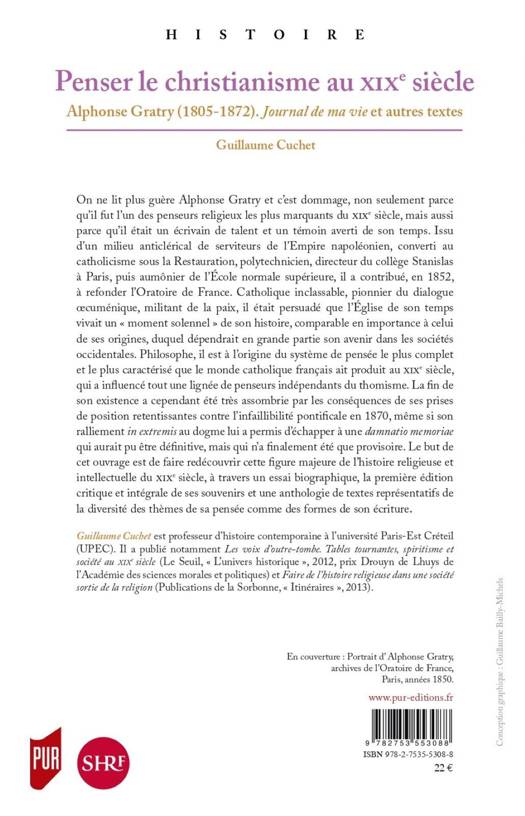 On ne lit plus guère Alphonse Gratry et c’est dommage, non seulement parce qu’il fut l’un des penseurs religieux les plus marquants du XIXe siècle, mais aussi parce qu’il était un écrivain de talent et un témoin averti de son temps. Issu d’un milieu anticlérical de serviteurs de l’Empire napoléonien, converti au catholicisme sous la Restauration, polytechnicien, directeur du collège Stanislas à Paris, puis aumônier de l’École normale supérieure, il a contribué, en 1852, à refonder l’Oratoire de France. Catholique inclassable, pionnier du dialogue oecuménique, militant de la paix, il était persuadé que l’Église de son temps vivait un « moment solennel » de son histoire, comparable en importance à celui de ses origines, duquel dépendrait en grande partie son avenir dans les sociétés occidentales. Philosophe, il est à l’origine du système de pensée le plus complet et le plus caractérisé que le monde catholique français ait produit au XIXe siècle, qui a influencé tout une lignée de penseurs indépendants du thomisme. La fin de son existence a cependant été très assombrie par les conséquences de ses prises de position retentissantes contre l’infaillibilité pontificale en 1870, même si son ralliement in extremis au dogme lui a permis d’échapper à une damnatio memoriae qui aurait pu être définitive, mais qui n’a finalement été que provisoire. Le but de cet ouvrage est de faire redécouvrir cette figure majeure de l’histoire religieuse et intellectuelle du XIXe siècle, à travers un essai biographique, la première édition critique et intégrale de ses souvenirs et une anthologie de textes représentatifs de la diversité des thèmes de sa pensée comme des formes de son écriture.