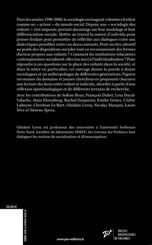 Dans les années 1990-2000, la sociologie envisageait volontiers l'enfant comme un « acteur » du monde social. Depuis, une autre sociologie des enfants s'est imposée, portant davantage sur leur modelage et leur différenciation sociale. Entre ces deux courants, comment penser l'enfant comme « individu » ? Peut-on être attentif au poids des dispositions sociales tout en reconnaissant des formes d'action propres aux enfants ? Comment les institutions éducatives contemporaines socialisent-elles (ou non) à l'individualisation ? Pour répondre à ces questions sur la place des enfants dans la société, et dans la nôtre en particulier, cet ouvrage donne la parole à douze sociologues et un anthropologue de différentes générations. Figures reconnues du domaine et jeunes chercheur·es proposent chacun·e une lecture des liens entre enfant et individu contemporains, abordée à partir d’une réflexion épistémologique et de différents terrains de recherche.