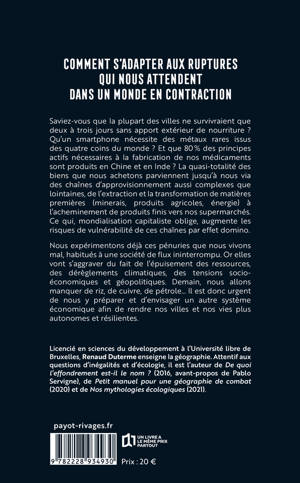 Saviez-vous que la plupart des villes ne survivraient que deux à trois jours sans apport extérieur de nourriture ? Qu'un smartphone nécessite des métaux rares issus des quatre coins du monde ? Et que 80% des principes actifs nécessaires à la fabrication de nos médicaments sont produits en Chine et en Inde ? La quasi-totalité des biens que nous achetons parviennent jusqu'à nous via des chaînes d'approvisionnement aussi complexes que lointaines, de l'extraction et la transformation de matières premières (minerais, produits agricoles, énergie) à l'acheminement de produits finis vers nos supermarchés. Ce qui, mondialisation capitaliste oblige, augmente les risques de vulnérabilité de ces chaînes par effet domino. Nous expérimentons déjà ces pénuries que nous vivons mal, habitués à une société de flux ininterrompu. Or elles vont s'aggraver du fait de l'épuisement des ressources, des dérèglements climatiques, des tensions socio-économiques et géopolitiques. Demain, nous allons manquer de riz, de cuivre, de pétrole... Il est donc urgent de nous y préparer et d'envisager un autre système économique afin de rendre nos villes et nos vies plus autonomes et résilientes.