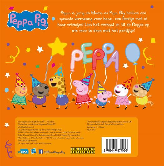 Het is feest, want 'Peppa Pig' is jarig in 'Peppa's verrassingsfeestje'! Dit interactieve prentenboek met flapjes barst van de vrolijkheid en maakt voorlezen nóg leuker. Mama en Papa Big hebben een speciale verrassing voor Peppa in petto: een feestje met ál haar vriendjes. Peppa staat in het middelpunt van belangstelling en jij kunt samen met haar alle verjaardagsverrassingen ontdekken.