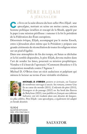 Ce livre est la suite directe du best-seller Père Elijah: une apocalypse, mettant en scène un moine carme, ancien homme politique israélien et rescapé de la Shoah, appelé par le pape à une mission périlleuse : ramener à la foi le président de la Fédération des États européens. Désormais évêque, Elijah, accompagné par le moine Enoch, entre à Jérusalem alors même que le Président y prépare une grande cérémonie de réconciliation de toutes les religions mises sur un pied d'égalité. Dans une atmosphère de fin des temps, où Satan se déchaîne et la foi semble disparaître, le père Elijah, devenu maître dans l'art de sonder les âmes, poursuit sa mission prophétique. Viendra-t-il à bout de l'apostasie ? Comment ébranlera-t-il la conjuration mondiale contre l'Agneau ? Michael D. O'Brien tisse un récit audacieux et palpitant qui mènera le lecteur au terme d'une véritable révélation. AUTEUR Michael D. O'Brien, peintre et écrivain, est l'auteur de nombreux ouvrages à succès. Ses romans, comme Une île au coeur du monde (2011), L'odyssée du père (2013), Étrangers et de passage (2017) ou Au bord des fleuves de Babylone (2023), tous publiés en français aux éditions Salvator, ont été traduits dans une dizaine de langues. Le plus célèbre, Père Elijah: une apocalypse, a également été adapté en bande dessinée.