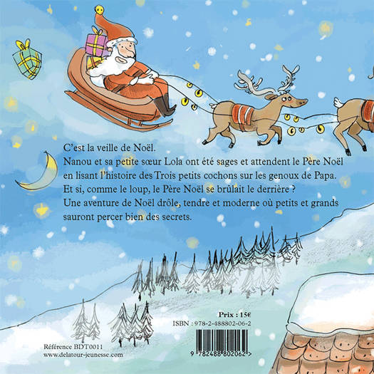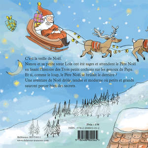 C’est la veille de Noël. Nanou et sa petite sœur Lola ont été sages et attendent le Père Noël en lisant l’histoire des Trois petits cochons sur les genoux de Papa. Et si, comme le loup, le Père Noël se brûlait le derrière ? Une aventure de Noël drôle, tendre et moderne où petits et grands sauront percer bien des secrets.