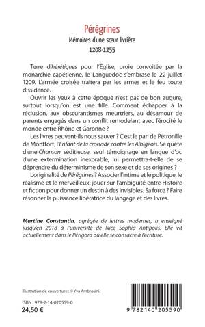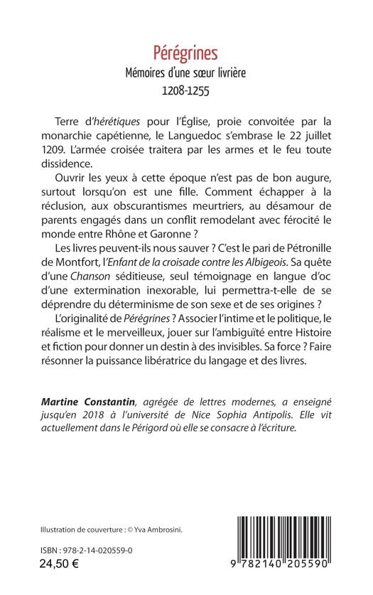 Terre d’hérétiques pour l’Église, proie convoitée par la monarchie capétienne, le Languedoc s’embrase le 22 juillet1209. L’armée croisée traitera par les armes et le feu toute dissidence.Ouvrir les yeux à cette époque n’est pas de bon augure,surtout lorsqu’on est une fille. Comment échapper à la réclusion, aux obscurantismes meurtriers, au désamour de parents engagés dans un conflit remodelant avec férocité le monde entre Rhône et Garonne ? Les livres peuvent-ils nous sauver ? C’est le pari de Pétronille de Montfort. Sa quête d’une Chanson séditieuse, seul témoignage en langue d’oc d’une extermination inexorable, lui permettra-t-elle de se déprendre du déterminisme de son sexe et de ses origines ? L’originalité de Pérégrines ? Associer l’intime et le politique, le réalisme et le merveilleux. Sa force ? Faire résonner la puissance libératrice du langage et des livres.