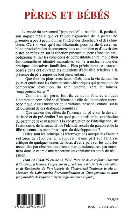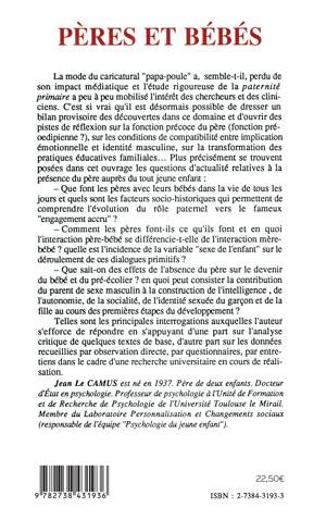 Que font les pères avec leurs bébés dans la vie de tous les jours? Comment les pères font-ils ce qu'ils font et en quoi l'interaction père-bébé se différencie-t-elle de l'interaction mère-bébé?... Autant de questions auxquelles l'auteur s'efforce de répondre.