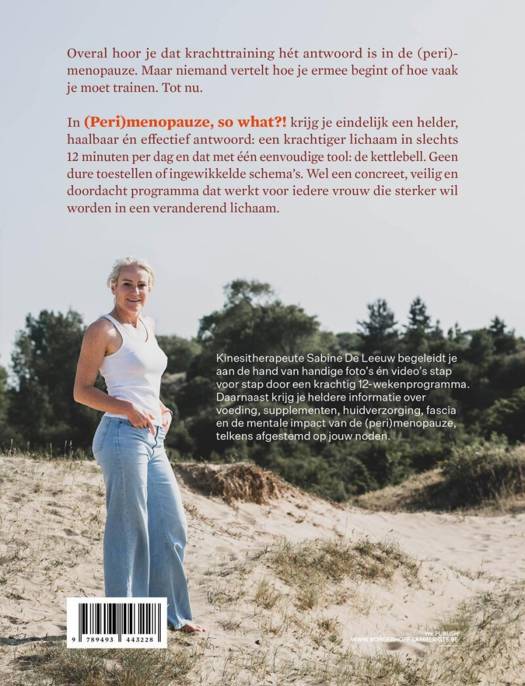 In ‘(Peri)menopauze, so what?!’ krijg je eindelijk een helder, haalbaar én effectief antwoord: een krachtiger lichaam in slechts 12 minuten per dag en dat met één eenvoudige tool: de kettlebell. Geen fitnessabonnement nodig. Geen ingewikkelde schema’s. Wel een concreet, veilig en doordacht programma dat werkt voor iedere vrouw die sterker wil worden in een veranderend lichaam. Je ontdekt in dit boek bovendien ook wat er hormonaal en fysiek gebeurt in deze levensfase, waarom krachtverlies quasi onvermijdelijkheid is, en hoe jij daar vandaag nog iets aan kunt doen. Auteur Sabine De Leeuw begeleidt je stap voor stap doorheen een krachtprogramma van 12 weken, in 12 minuten per dag. Daarnaast krijg je heldere inzichten over voeding, slaap, supplementen en mentale veerkracht, afgestemd op wat je lichaam nu écht nodig heeft.