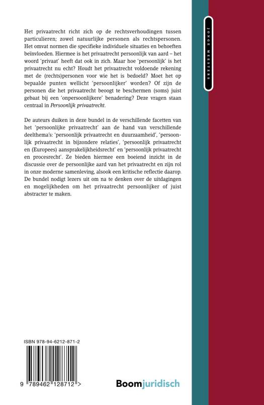 Het privaatrecht richt zich op de rechtsverhoudingen tussen particulieren; zowel natuurlijke personen als rechtspersonen. Het omvat normen die specifieke individuele situaties en behoeften beïnvloeden. Hiermee is het privaatrecht persoonlijk van aard – het woord ‘privaat’ heeft dat ook in zich. Maar hoe ‘persoonlijk’ is het privaatrecht nu echt? Houdt het privaatrecht voldoende rekening met de (rechts)personen voor wie het is bedoeld? Moet het op bepaalde punten wellicht ‘persoonlijker’ worden? Of zijn de personen die het privaatrecht beoogt te beschermen (soms) juist gebaat bij een ‘onpersoonlijkere’ benadering? Deze vragen staan centraal in Persoonlijk privaatrecht.