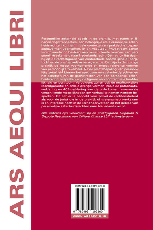 Persoonlijke zekerheid speelt in de praktijk, met name in financieringstransacties, een belangrijke rol. Persoonlijke zekerheidsrechten kunnen in vele contexten en praktische toepassingsvormen voorkomen. In dit Ars Aequi Privaatrecht cahier wordt aandacht besteed aan verschillende vormen van persoonlijke zekerheid naar Nederlands recht. De nadruk ligt daarbij op de rechtsfiguren van contractuele hoofdelijkheid, borgtocht en de onafhankelijke bankgarantie. Dat zijn in de huidige praktijk de meest voorkomende en meest relevante vormen van persoonlijke zekerheid. Na de plaatsbepaling van persoonlijke zekerheid binnen het spectrum van zekerheidsrechten en het schetsen van de grondtrekken van een persoonlijk zekerheidsrecht, bespreken wij de figuren van contractuele hoofdelijkheid en borgtocht. Vervolgens zullen ook de onafhankelijke (bank)garantie en enkele overige vormen, zoals de patronaatsverklaring en 403-verklaring aan de orde komen, waarna de verschillende mogelijkheden om verhaal te nemen worden besproken. Dit cahier is bedoeld voor zowel de rechtenstudent als voor de jurist die in de praktijk of wetenschap werkzaam is en interesse heeft in de kernonderwerpen op het gebied van persoonlijke zekerheidsrechten naar Nederlands recht.