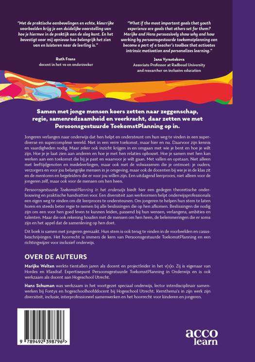 Jongeren verlangen naar onderwijs dat hen helpt en ondersteunt om hun weg te vinden in een superdiverse en supercomplexe wereld. Niet in een verre toekomst, maar hier en nu. Daarvoor zijn kennis en vaardigheden nodig. Maar zeker ook inzicht krijgen in en omgaan met wie je bent en hoe je wilt zijn. Hoe je je laat zien aan anderen en hoe je met hen relaties opbouwt. Hoe je samen met hen kan werken aan een toekomst die bij je past en waarvoor je wilt gaan. Met vallen en opstaan. Niet alleen met leeftijdgenoten en medeleerlingen, maar ook met de volwassenen die je ontmoet: je ouders, verzorgers en voor jou belangrijke mensen in je omgeving, maar ook de docenten bij wie je in de klas zit en de mentoren en begeleiders die er voor jou willen zijn. Een uitdagend leerproces, niet alleen voor de jongeren zelf, maar ook voor de mensen om hen heen. Persoonsgestuurde ToekomstPlanning in het onderwijs biedt hier een gedegen theoretische onderbouwing en praktische handvatten voor. Een diversiteit aan werkvormen helpt onderwijsprofessionals een eigen weg te vinden om dit leerproces te ondersteunen. Om jongeren te helpen hun stem te laten horen en steeds beter regie te nemen bij alle beslissingen die op hen afkomen. Beslissingen die nodig zijn om een voor hen goed leven te kunnen leiden, passend bij hun wensen, verlangens, ambities en talenten. Maar die ook rekening houden met de mensen om hen heen, de belemmeringen die er soms zijn en het appel dat de samenleving op hen doet. Dit boek is samen met jongeren gemaakt. Hun stem is ook terug te vinden in de voorbeelden en casusbeschrijvingen. Het hoorrecht is immers de kern van Persoonsgestuurde ToekomstPlanning en een richtingwijzer voor inclusief onderwijs.