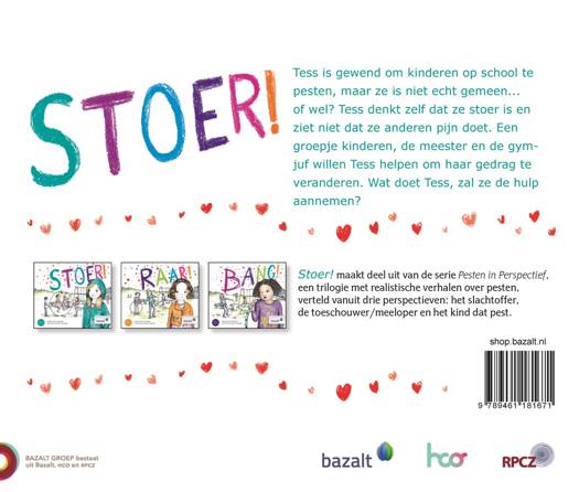 De set Pesten in Perspectief bestaat uit de uitgaven Raar!, Bang! en Stoer!. Een trilogie met realistische verhalen over pesten, verteld vanuit drie perspectieven: het slachtoffer, de toeschouwer/meeloper en het kind dat pest. Wil je met dit thema aan de slag, dan heb je alle drie de boeken nodig. Op die manier kun je het thema pesten vanuit de verschillende perspectieven onder de aandacht brengen.