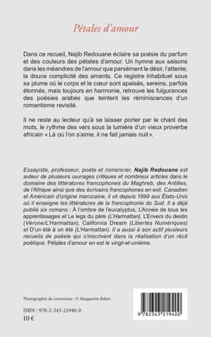 Dans ce recueil, Najib Redouane éclaire sa poésie du parfum et des couleurs des pétales d'amour. Un hymne aux saisons dans les méandres de l'amour que parsèment le désir, l'attente, la douce complicité des amants. Ce registre inhabituel sous sa plume où le corps et le coeur sont apaisés, sereins, parfois étonnés, mais toujours en harmonie, retrouve les fulgurances des poésies arabes que teintent les réminiscences d'un romantisme revisité. Il ne reste au lecteur qu'à se laisser porter par le chant des mots, le rythme des vers sous la lumière d'un vieux proverbe africain « Là où l'on s'aime, il ne fait jamais nuit ».