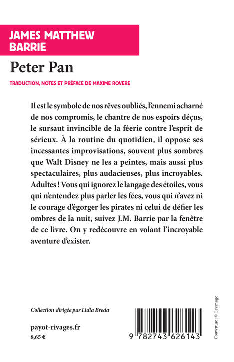 Il est le symbole de nos rêves oubliés, l'ennemi acharné de nos compromis, le chantre de nos espoirs déçus, le sursaut invincible de la féerie contre l'esprit de sérieux. À la routine du quotidien, il oppose ses incessantes improvisations, souvent plus sombres que Walt Disney ne les a peintes, mais aussi plus spectaculaires, plus audacieuses, plus incroyables. Adultes ! Vous qui ignorez le langage des étoiles, vous qui n'entendez plus parler les fées, vous qui n'avez ni le courage d'égorger les pirates ni celui de défier les ombres de la nuit, suivez J.M. Barrie par la fenêtre de ce livre. On y redécouvre en volant l'incroyable aventure d'exister.