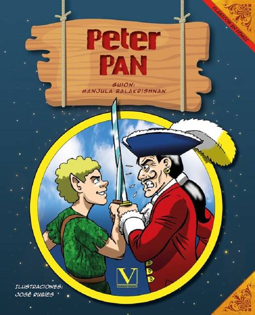 Peter Pan, la inmortal obra teatral infantil de James Matthew Barry, popularizada por el cine, aparece ahora en forma de cómic en una nueva versión, con preciosos dibujos y un divertido texto.La sugerente historia mágica del niño que no quería crecer vuelve para hacernos disfrutar con personajes entrañables como Wendy, la niñera Nana, el hada Campanilla, los niños perdidos, el gracioso oficial Mr. Smee, el malvado capitán Garfio y el simpático cocodrilo que quiere comerse a este último.Increíbles aventuras en el Londres de principios del siglo XX, en la aldea de los indios, la laguna de las sirenas, el barco de los piratas y en el cielo, pues el sugestivo país de Nunca Jamás está junto a la segunda estrella a la derecha.Un clásico que las nuevas generaciones de niños lectores deben conocer.