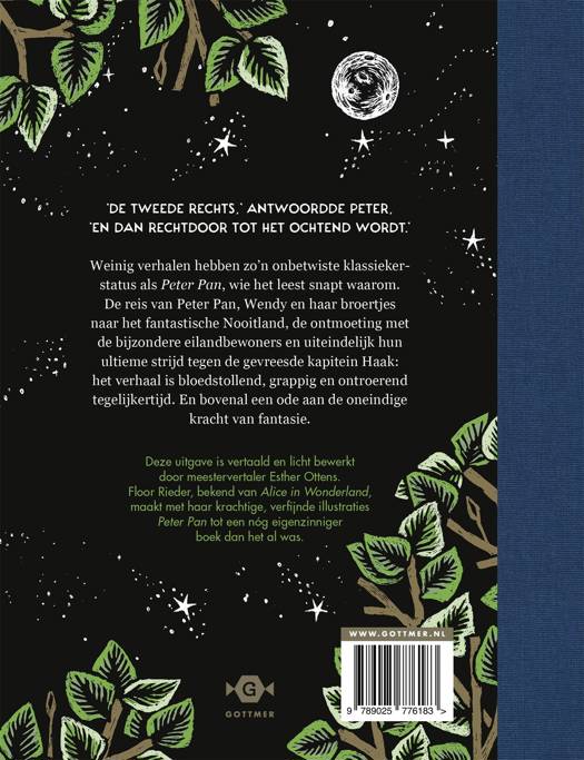 Deze fonkelende uitgave is vertaald en zorgvuldig bewerkt door de ervaren meester-vertaalster Esther Ottens. Met haar unieke, krachtige en gedurfde illustraties heeft Gouden Penseel-winnares Floor Rieder het geliefde verhaal een zeer eigenzinnige en originele uitstraling gegeven, waardoor dit boek nog meer zal schitteren dan ooit tevoren. 'Peter Pan' is geschikt voor lezers van 8 jaar en ouder.
