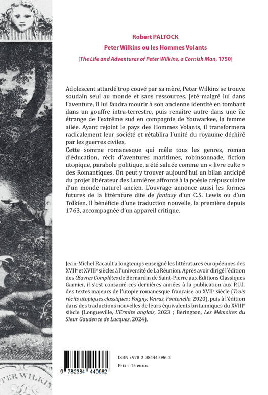 Adolescent attardé trop couvé par sa mère, Peter Wilkins se trouve soudain seul au monde et sans ressources. Jeté malgré lui dans l’aventure, il lui faudra mourir à son ancienne identité en tombant dans un gouffre intra-terrestre, puis renaître autre dans une île étrange de l’extrême sud en compagnie de Youwarkee, la femme ailée. Ayant rejoint le pays des Hommes Volants, il transformera radicalement leur société et rétablira l’unité du royaume déchiré par les guerres civiles. Cette somme romanesque qui mêle tous les genres, roman d’éducation, récit d’aventures maritimes, robinsonnade, fiction utopique, parabole politique, a été saluée comme un « livre culte » des Romantiques. On peut y trouver aujourd’hui un bilan anticipé du projet libérateur des Lumières affronté à la poésie crépusculaire d’un monde naturel ancien. L’ouvrage annonce aussi les formes futures de la littérature dite de fantasy d’un C.S. Lewis ou d’un Tolkien. Il bénéficie d’une traduction nouvelle, la première depuis 1763, accompagnée d’un appareil critique.