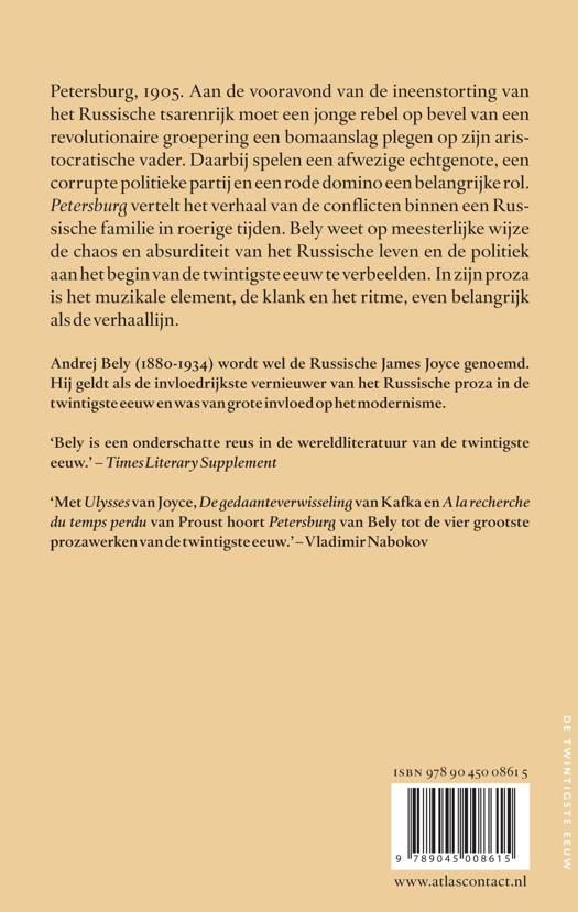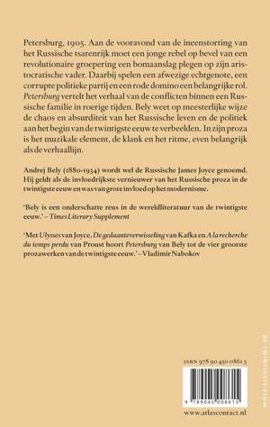 Petersburg, 1905. Aan de vooravond van de ineenstorting van het Russische tsarenrijk moet een jonge rebel op bevel van een revolutionaire groepering een bomaanslag plegen op zijn aristocratische vader. Daarnaast spelen een afwezige echtgenote, een corrupte politieke partij en een geheimzinnige Rode Domino een belangrijke rol. Petersburg vertelt het verhaal van een Russische familie in de knoop met zichzelf in roerige tijden. Bely weet op meesterlijke wijze de chaos en absurditeit van het Russische leven en de politiek aan het begin van de twintigste eeuw te verbeelden. In zijn proza is het muzikale element, de klank en het ritme, even belangrijk als de verhaallijn.