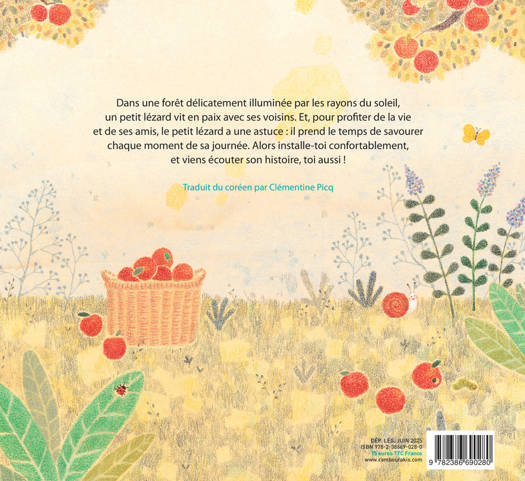 Dans une forêt délicatement illuminée par les rayons du soleil, un petit lézard vit en paix avec ses voisins. Et, pour profiter de la vie et de ses amis, le petit lézard a une astuce : il prend le temps de savourer chaque moment de sa journée. Alors installe-toi confortablement, et viens écouter son histoire, toi aussi !