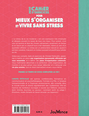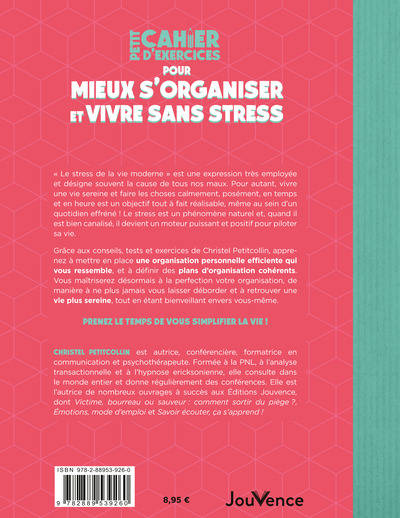 « Le stress de la vie moderne » est une expression très employée et désigne souvent la cause de tous nos maux. Pour autant, vivre une vie sereine et faire les choses calmement, posément, en temps et en heure est un objectif tout à fait réalisable, même au sein d’un quotidien effréné ! Le stress est un phénomène naturel et, quand il est bien canalisé, il devient un moteur puissant et positif pour piloter sa vie. Grâce aux conseils, tests et exercices de Christel Petitcollin, apprenez à mettre en place une organisation personnelle efficiente qui vous ressemble, et à définir des plans d’organisation cohérents. Vous maîtriserez désormais à la perfection votre organisation, de manière à ne plus jamais vous laisser déborder et à retrouver une vie plus sereine, tout en étant bienveillant envers vous-même. Prenez le temps de vous simplifier la vie !