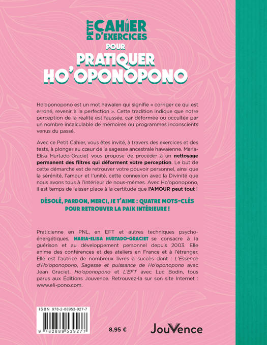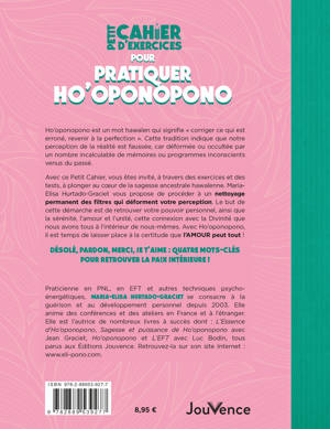 Ho’oponopono est un mot hawaïen qui signifie « corriger ce qui est erroné, revenir à la perfection ». Cette tradition indique que notre perception de la réalité est faussée, car déformée ou occultée par un nombre incalculable de mémoires ou programmes inconscients venus du passé. Avec ce Petit Cahier, vous êtes invité, à travers des exercices et des tests, à plonger au cœur de la sagesse ancestrale hawaïenne. Maria-Elisa Hurtado-Graciet vous propose de procéder à un nettoyage permanent des filtres qui déforment votre perception. Le but de cette démarche est de retrouver votre pouvoir personnel, ainsi que la sérénité, l’amour et l’unité, cette connexion avec la Divinité que nous avons tous à l’intérieur de nous-mêmes. Avec Ho’oponopono, il est temps de laisser place à la certitude que l’AMOUR peut tout ! Désolé, pardon, merci, je t’aime : quatre mots-clés pour retrouver la paix intérieure !