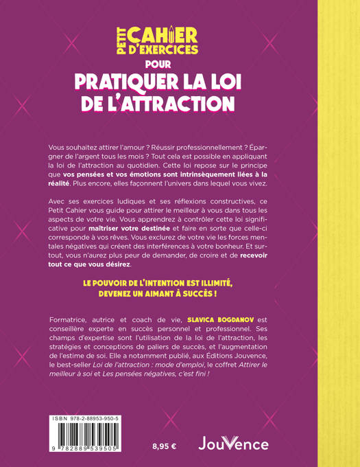 Avec ses exercices ludiques et ses réflexions constructives, ce Petit Cahier vous guide pour attirer le meilleur à vous dans tous les aspects de votre vie. Vous apprendrez à contrôler cette loi significative pour maîtriser votre destinée et faire en sorte que celle-ci corresponde à vos rêves. Vous exclurez de votre vie les forces mentales négatives qui créent des interférences à votre bonheur. Et surtout, vous n’aurez plus peur de demander, de croire et de recevoir tout ce que vous désirez.