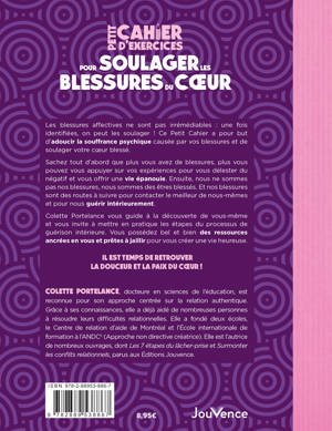 Les blessures affectives ne sont pas irrémédiables : une fois identifiées, on peut les soulager ! Ce Petit Cahier a pour but d’adoucir la souffrance psychique causée par vos blessures et de soulager votre cœur blessé. Sachez tout d’abord que plus vous avez de blessures, plus vous pouvez vous appuyer sur vos expériences pour vous délester du négatif et vous offrir une vie épanouie. Ensuite, nous ne sommes pas nos blessures, nous sommes des êtres blessés. Et nos blessures sont des routes à suivre pour contacter le meilleur de nous-mêmes et pour nous guérir intérieurement. Colette Portelance vous guide à la découverte de vous-même et vous invite à mettre en pratique les étapes du processus de guérison intérieure. Vous possédez bel et bien des ressources ancrées en vous et prêtes à jaillir pour vous créer une vie heureuse. Il est temps de retrouver la douceur et la paix du cœur !