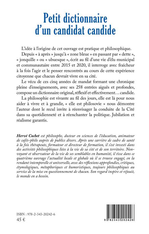 Ce petit dictionnaire, des entrées « à après » à « zone bleue », en passant par « dette », « jonquille » et « ubuesque », a été écrit au fil d'une vie d'élu municipal et communautaire entre 2015 et 2020. Il interroge à la fois l'agir et le penser rencontrés au cours de cette expérience citoyenne que chacun devrait vivre en sa cité. Le vécu de ce mandat forme une chronique plein d'enseignements, avec 258 entrées réflexives et candides. L'auteur nous démontre que la philosophie est vivante au fil des jours, elle est là pour nous aider à vivre et à grandir. Il nous invite à réenchanter la politique au quotidien dans la cité.