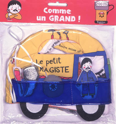 Un livre-tissu pour jouer à changer une roue, mettre de l'essence dans les voitures des clients et réparer le moteur d'une camionnette. Avec des éléments en tissu à placer sur les pages.