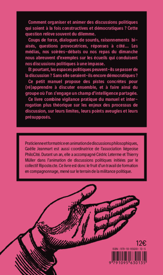 Comment organiser et animer des discussions politiques qui soient à la fois constructives et démocratiques ? Pour les personnes des milieux militants ou associatifs, cette question relève souvent du dilemme. Ce livre est destiné à toute personne qui cherche à faire du groupe où elle s'engage un champ d'intelligence partagée. Il combine aspects pratiques et réflexions sur les processus : leurs enjeux, présupposés, limites et points aveugles. Il est le fruit d'une rencontre entre deux militants et une formatrice en animation de discussions philosophiques ; ensemble, ils ont expérimenté et réfléchi durant un an la pratique de la discussion politique.