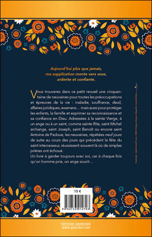 Vous trouverez dans ce petit recueil une cinquantaine de neuvaines pour toutes les préoccupations et épreuves de la vie : maladie, souffrance, deuil, affaires juridiques, examens… mais aussi pour protéger les enfants, la famille et exprimer sa reconnaissance et sa confiance en Dieu. Adressées à la sainte Vierge, à un ange ou à un saint, comme sainte Rita, saint Michel archange, saint Joseph, saint Benoît ou encore saint Antoine de Padoue, les neuvaines, répétées neuf jours de suite au cours des jours qui précèdent la fête du saint intercesseur, réussissent souvent là où de simples prières ont échoué. Un livre à garder toujours avec soi, car à chaque fois qu’un homme prie, un ange sourit…