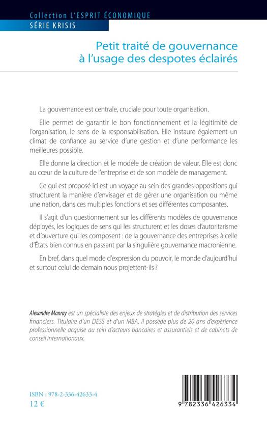 La gouvernance est centrale, cruciale pour toute organisation. Elle permet de garantir le bon fonctionnement et la légitimité de l'organisation, le sens de la responsabilisation. Elle instaure également un climat de confiance au service d'une gestion et d'une performance les meilleures possible. Elle donne la direction et le modèle de création de valeur. Elle est donc au coeur de la culture de l'entreprise et de son modèle de management. Ce qui est proposé ici est un voyage au sein des grandes oppositions qui structurent la manière d'envisager et de gérer une organisation ou même une nation, dans ces multiples fonctions et ses différentes composantes. Il s'agit d'un questionnement sur les différents modèles de gouvernance déployés, les logiques de sens qui les structurent et les doses d'autoritarisme et d'ouverture qui les composent. En bref, dans quel mode d'expression du pouvoir, le monde d'aujourd'hui et surtout celui de demain nous projettent-ils ?