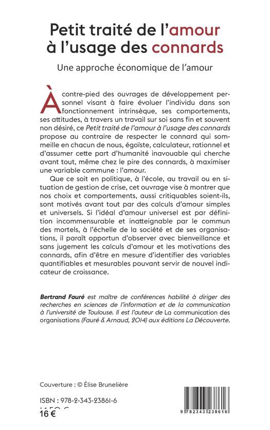 À contre-pied des ouvrages de développement personnel visant à faire évoluer l'individu dans son fonctionnement intrinsèque, à travers un travail sur soi sans fin et souvent non désiré, ce Petit traité de l'amour à l'usage des connards propose au contraire de respecter le connard qui sommeille en chacun de nous, et d'assumer cette part d'humanité inavouable qui cherche avant tout, à maximiser une variable commune: l'amour. Que ce soit en politique, à l'école, ou en situation de gestion de crise, cet ouvrage vise à montrer que nos choix et comportements, aussi critiquables soient-ils, sont motivés avant tout par des calculs d'amour simples et universels.