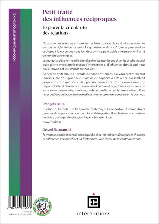 Nous sommes reliés les uns aux autres bien audelà de ce dont nous sommes conscients. Quiinfl uence qui ? Et mène la danse. Que se passe-t-il en coulisse ? C’est ce que vous fait découvrir ce petit guide chaleureux et illustré de nombreux exemples. Les auteurs y dévoilent la grille d’analyse (utilisée par les coachs et les psy) qui explicite avec clarté le réseau d’interactions et d’infl uences dans lequel nous nous trouvons et leur impact sur nos vies. Approche systémique et circularité sont des termes qui vous seront bientôt familiers car c’est grâce à leurs lumineuses capacité d’éclairer ce qui semblait jusqu’ici bizarre que vous allez prendre conscience de vos vraies zones de responsabilité et d’infl uence, savoir où et comment agir, à tous les niveaux de votre vie : personnelle, familiale, professionnelle, amicale, associative… Pour tisser des liens qui apportent mieux vivre ensemble et construisent les bonheurs. Des bonheurs qui auront la merveilleuse capacité de rebondir de main en main. Découvrez comment chaque jour nous coconstruisonsnos bonheurs et nos malheurs