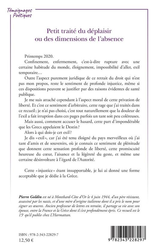 Printemps 2020. Confinement, enfermement, c'est-à-dire rupture avec une certaine habitude du monde, éloignement, impossibilité d'aller, exil temporaire... Outre l'aspect purement juridique de ce retrait du droit qui n'est pas mon propos, reste le sentiment de profonde injustice, même si ces dispositions peuvent se justifier par des raisons évidentes de santé publique. Je me suis attaché cependant à l'aspect moral de cette privation de liberté. Et c'est ce sentiment d'arbitraire, cette rage que j'ai traités dans ce recueil ; je n'ai pas choisi, c'est tout naturellement que la douleur de l'exil a fait irruption dans ces pages parfois un tant soit peu coléreuses. Mais aussi, comment accuser le hasard, cette part d'impondérable que les Grecs appelaient le Destin ? Alors à qui dois-je cet exil ? Je dis « exil », car j'ai été tenu éloigné du pays merveilleux où j'ai tant d'amis et de souvenirs, où je connais ce sentiment de plénitude que donnent cette sensation profonde de liberté, cette promiscuité heureuse du cœur, l'aisance et la légèreté du geste, et même une certaine désinvolture à l'égard de l'Autorité. Cette « injustice » étant insupportable, je lui ai donné une forme acceptable que je dédie à la Grèce.