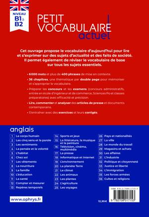 Cet ouvrage propose le vocabulaire anglais d’aujourd’hui qui permet de lire et de s’exprimer sur des sujets d’actualité ou des faits de société, et réviser le vocabulaire de base sur tous les sujets essentiels. Cette nouvelle édition enrichie offre aux apprenants le vocabulaire le plus actuel dans des domaines variés : multimédia, environnement, santé, finance, etc. Idéal pour lire et commenter les articles de presse, et réviser son vocabulaire pour se préparer aux examens (baccalauréat, concours administratifs, entrée en école d’ingénieur, Sciences Po et classes préparatoires). En complément, des annexes pour approfondir certains points grammaticaux, et des exercices d’application avec leurs corrigés sont à retrouver en fin d’ouvrage.
