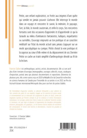 Petite, une enfant exploratrice, se frotte aux énigmes d'une quête qui ne semble jamais ne pouvoir s'achever. Elle circule de manière ludique et imprévisible au travers de mondes successifs. Ces récits poétiques prennent un caractère méditatif sur l'état du monde actuel. Derrière les récits de Petite se cache un traité simplifié d'anthropologie.