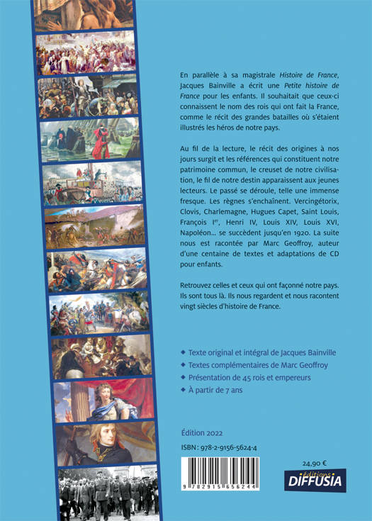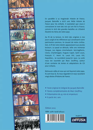Présentation de 45 rois et empereurs. En parallèle à sa magistrale Histoire de France, Jacques Bainville a écrit une Petite histoire de France pour les enfants. Il souhaitait que ceux-ci connaissent le nom des rois qui ont fait la France, comme le récit des grandes batailles où s'étaient illustrés les héros de notre pays. Au fil de la lecture, le récit des origines à nos jours surgit et les références qui constituent notre patrimoine commun, notre civilisation, notre destin apparaissent aux jeunes lecteurs. Le passé se déroule, telle une immense fresque. Les règnes s'enchaînent. Vercingétorix, Clovis, Charlemagne, Hugues Capet, Saint-Louis, François Ier, Henri IV, Louis XIV, Louis XVI, Napoléon... se succèdent jusqu en 1920. Le texte de Jacques Bainville s'achève au lendemain de la Première Guerre mondiale. Il fallait une suite. Nous l'avons demandée à Marc Geoffroy, auteur de plus de cinquante textes et d'adaptations de CD pour enfants. Nous avons souhaité embellir ce livre de nombreux compléments comme les portraits de rois et les grandes scènes de leur règne. Ces dessins ont été gravés par les plus grands artistes du XIXe siècle comme Gustave Doré, Paul Lehugeur, Maurice Leloir et bien d autres encore. Nous avons également ajouté des dessins de Job, dont certains figurent, en noir et blanc, dans l'édition originale. Ces illustrations ont contribué à entretenir le culte des héros de la nation et ont enchantées des générations d'enfants. Les dessins contemporains des souverains sont signés de Yann. De nombreuses photos de monuments, qui ont été les témoins muets, agrémentent cet ouvrage. Rejoignez celles et ceux qui ont façonné notre pays. Ils nous regardent et nous racontent vingt siècles d'histoire de France. Plus de 200 illustrations de Gustave Doré, H. Grobet, Paul Lehugeur, Maurice Lenoir, Frédéric Lix, Albert Robida, Paul de Sémant... Dès 7 ans