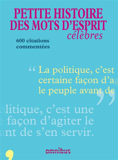 Mises en situation et enrichies de commentaires, 600 citations réunies dans un recueil qui est aussi un livre de référence.Mises en situation et enrichies de commentaires, 600 citations réunies dans un recueil qui est aussi un livre de référence.Devinettes. 1. Qui le premier a voulu bâtir les villes à la campagne ? 2. De Rabelais ou Montaigne, lequel a écrit qu'" au plus élevé trône du monde, nous ne sommes assis que sur notre cul " ? 3. Qui était l'homme célèbre dont on disait qu'" il était capable de tout pour de l'argent, même d'une bonne action " ? 4. " Le voilà donc ce nez qui, des traits de son maître / S'est souillé lâchement ! Il en rougit, le traître ! " Vous savez qui a écrit ces vers... mais qui Edmond Rostand parodiait-il ? 5. Quel est l'homme d'esprit français qui détestait le plus les enfants ? 6. Qu'est-ce qu'un kakemphaton ? Réponses puisées dans la Petite histoire des mots d'esprit célèbres. 1. M. Prudhomme. Ce personnage d'Henri Monnier est l'auteur trop oublié de beaucoup de mots passés dans le langage commun. Son bon sens lui avait fait noter que " si Bonaparte fût resté lieutenant d'artillerie, il serait encore sur le trône ". Nous lui devons aussi : " C'est mon opinion et je la partage. " 2. Montaigne, dans le chapitre " De l'expérience " de ses Essais. Il poursuit ainsi : " Nous avons beau monter sur des échasses. Sur des échasses encore faut-il marcher sur nos jambes. " 3. Mirabeau. L'auteur du mot est le pamphlétaire royaliste Rivarol, qui disait du même, connu pour sa laideur : " C'est l'homme du monde qui ressemble le plus à sa réputation. " 4. Théophile de Viau, poète précieux qui avait écrit en 1621 un très sérieux Pyrame et Thisbé dans lequel on lisait : " Ah ! voici le poignard qui, du sang de son maître / S'est souillé lâchement : il en rougit, le traître... " 5. Paul Léautaud, sans doute. Á ceux qui étaient tentés de câliner les bébés, il conseillait de résister : comment savoir si l'un d'eux ne deviendrait pas Hitler ? 6. Un kakemphaton est un calembour involontaire. Le plus célèbre est de Corneille, dans Polyeucte : " Vous me connaissez mal : la même ardeur me brûle / Et le désir s'accroît quand l'effet se recule. "