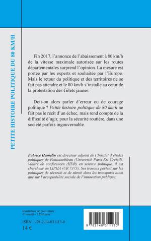 Fin 2017, l'annonce de l'abaissement à 80 km/h de la vitesse maximale autorisée sur les routes départementales surprend l'opinion. La mesure est portée par les experts et souhaitée par l'Europe. Mais le retour du politique et des territoires ne se fait pas attendre et le 80 km/h s'installe au coeur de la protestation des Gilets jaunes. Doit-on alors parler d'erreur ou de courage politique ? Petite histoire politique du 80 km/h ne fait pas le récit d'un échec, mais rend compte de la difficulté d'agir, pour la sécurité routière, dans une société parfois ingouvernable.