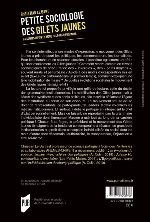 Par son intensité, par ses modes d'expression, le mouvement des Gilets jaunes a pris de court les politiques, les commentateurs, les journalistes. Pour les chercheurs en sciences sociales, il constitue également un défi : qui sont exactement les Gilets jaunes ? Comment rendre compte en termes sociologiques de cette France des "invisibles", des "petits moyens", souvent rurale et péri-urbaine ? Au-delà des motifs d'exaspération mis en avant (taxe sur le carburant dans un premier temps), comment expliquer une telle mobilisation de masse ? De quelles évolutions sociétales le mouvement des Gilets jaunes témoigne-t-il ? La lecture ici proposée privilégie une grille de lecture, celle du déclin des grammaires institutionnelles. La mobilisation des Gilets jaunes naît à l'écart des syndicats et des partis politiques, elle inscrit la défiance à l'égard des institutions au coeur de son discours. Le mouvement refuse de se doter de représentants, de porte-parole, de leaders. Il défie volontiers les médias institutionnels. Et surtout, il défie le politique en interpellant le chef d'Etat personnellement. Mais ce faisant, ne reproduit-il pas la grammaire individualisée dont Emmanuel Macron a usé tout au long de sa carrière politique ? Chacun à sa façon, le président et le mouvement des Gilets jaunes témoignent de la tendance contemporaine à récuser les grandeurs institutionnelles au profit d'une conception individualisée du social, dont les mots d'ordre sont désormais l'authenticité, la transparence, l'injonction à être soi-même.