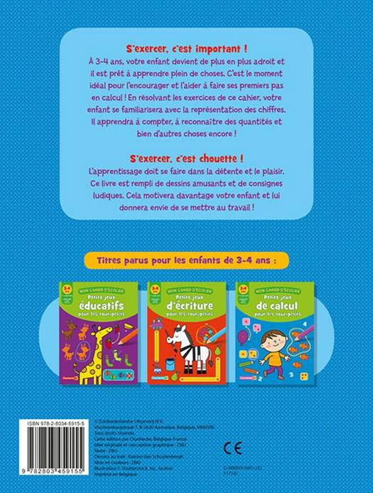 S'exercer, c'est important ! À 3-4 ans, votre enfant devient de plus en plus adroit et il est prêt à apprendre plein de choses. C'est le moment idéal pour l'encourager et l'aider à faire ses premiers pas en calcul ! En résolvant les exercices de ce cahier, votre enfant se familiarisera avec la représentation des chiffres. Il apprendra à compter, à reconnaître des quantités et bien d'autres choses encore ! S'exercer, c'est chouette ! L'apprentissage doit se faire dans la détente et le plaisir. Ce livre est rempli de dessins amusants et de consignes ludiques. Cela motivera davantage votre enfant et lui donnera envie de se mettre au travail !
