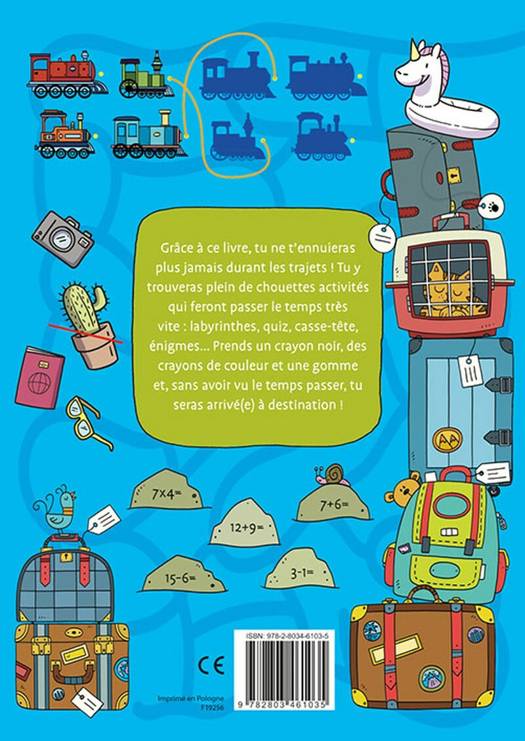 Grâce à ce livre, tu ne t'ennuieras plus jamais durant les trajets ! Tu y trouveras plein de chouettes activités qui feront passer le temps très vite : labyrinthes, quiz, casse-tête, énigmes... Prends un crayon noir, des crayons de couleur et une gomme et, sans avoir vu le temps passer, tu seras arrivé(e) à destination !