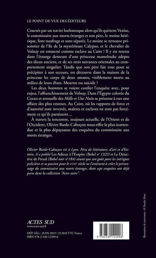 Coursés par un navire barbaresque alors qu'ils quittent Venise, le commissaire aux morts étranges et son père, le moine hérétique, font naufrage et sont séparés. Le moine se retrouve prisonnier de l'île de la mystérieuse Calypso, et le chevalier de Volnay est emmené comme esclave au Caire ! Il y est retenu dans l'étrange demeure d'une princesse mamelouke adepte des dieux anciens, et de ses trois suivantes orientales au comportement singulier. Tandis que son père fait tout pour se précipiter à son secours, on découvre dans la maison de la princesse les corps de deux amants, visiblement morts au milieu de leurs ébats. Meurtre ou suicide ?