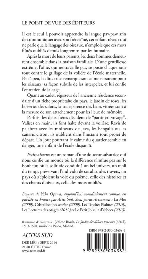 «Petits oiseaux» est un roman d'une douceur salvatrice qui nous confie un monde où la différence n'influe pas sur le bonheur, où la solitude conduit à un bel univers, un repli du temps préservant l'individu de ses absurdes travers, un pays où s'éploient la voix du poème, celle des histoires et des chants d'oiseaux, celle des mots oubliés.