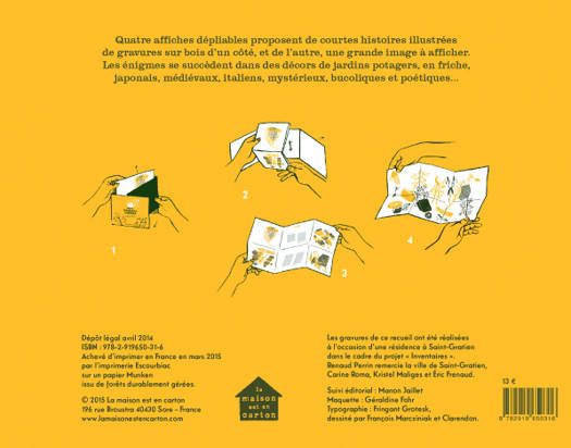 Quatre affiches dépliables (63 x 34 cm) proposent de courtes histoires illustrées de gravures sur bois d’un côté, et de l’autre, une grande image à afficher. Les énigmes se succèdent dans des décors de jardins potagers, en friche, japonais, médiévaux, italiens, mystérieux, bucoliques et poétiques. Livré dans un étui.