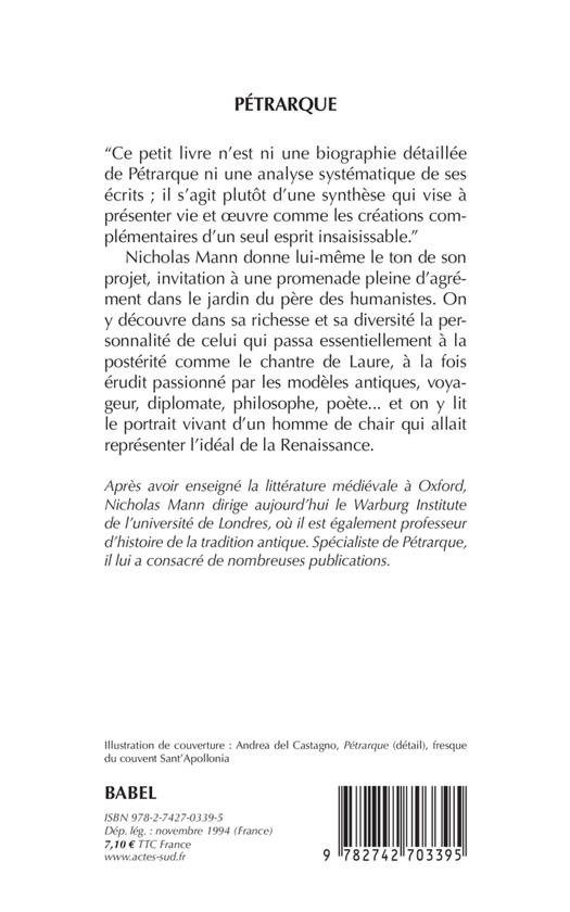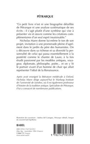 "Ce petit livre n'est ni une biographie détaillée de Pétrarque ni une analyse systématique de ses écrits; il s'agit plutôt d'une synthèse qui vise à présenter vie et oeuvre comme les créations complémentaires d'un seul esprit insaisissable." Nicholas Mann donne lui-même le ton de son projet, invitation à une promenade pleine d'agrément dans le jardin du père des humanistes. On y découvre dans sa richesse et sa diversité la personnalité de celui qui passa essentiellement à la postérité comme le chantre de Laure, à la fois érudit passionné par les modèles antiques, voyageur, diplomate, philosophe, poète... et on y lit le portrait vivant d'un homme de chair qui allait représenter l'idéal de la Renaissance.