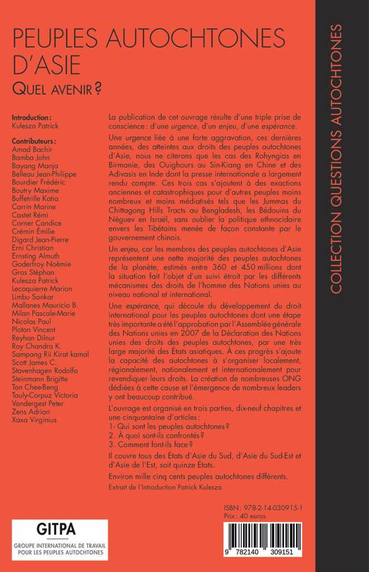 Qui sont les peuples autochtones ? À quoi sont-ils confrontés ? Comment font-ils face ? La publication de cet ouvrage résulte d'une triple prise de conscience : d'une urgence, d'un enjeu, d'une espérance. Une urgence liée à une forte aggravation, ces dernières années, des atteintes aux droits des peuples autochtones d'Asie (Rohyngias en Birmanie, Ouighours au Sin-Kiang en Chine, Adivasis en Inde ). Un enjeu, car les membres des peuples autochtones d'Asie représentent une nette majorité des peuples autochtones de la planète, estimés entre 360 et 450 millions dont la situation fait l'objet d'un suivi étroit par les différents mécanismes des droits de l'homme des Nations unies au niveau national et international. Une espérance, qui découle du développement du droit international pour les peuples autochtones dont une étape très importante a été l'approbation par l'Assemblée générale des Nations unies en 2007 de la Déclaration des Nations unies des droits des peuples autochtones. La création de nombreuses ONG dédiées à cette cause et l'émergence de nombreux leaders y ont beaucoup contribué.