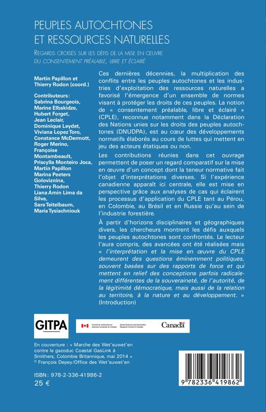 Ces dernières décennies, la multiplication des conflits entre les peuples autochtones et les industries d’exploitation des ressources naturelles a favorisé l’émergence d’un ensemble de normes visant à protéger les droits de ces peuples. La notion de « consentement préalable, libre et éclairé » (CPLE), reconnue notamment dans la Déclaration des Nations unies sur les droits des peuples autochtones (DNUDPA), est au cœur des développements normatifs élaborés au cours de luttes qui mettent en jeu des acteurs étatiques ou non. Les contributions réunies dans cet ouvrage permettent de poser un regard comparatif sur la mise en œuvre d’un concept dont la teneur normative fait l’objet d’interprétations diverses. Si l’expérience canadienne apparaît ici centrale, elle est mise en perspective grâce aux analyses de cas qui éclairent les processus d’application du CPLE tant au Pérou, en Colombie, au Brésil et en Russie qu’au sein de l’industrie forestière.