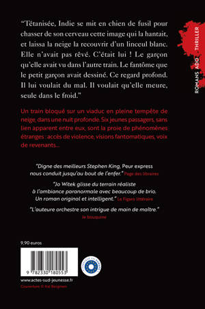 Un TGV tombe en panne sur un viaduc au milieu d'une tempête. Parmi les passagers, six adolescents - qui ne se connaissent pas - sont soudain la proie de phénomènes étranges : hallucinations, apparitions fantomatiques, voix de revenants... D'abord terrifiés, ils basculent dans la violence. L'un d'eux agresse le contrôleur, un autre menace des voyageurs avec un couteau. Actes de vandalisme perpétrés par une bande organisée, comme le prétendra la presse, ou faits inexplicables défiant la logique et l'entendement ? Quel lien mystérieux unit ces jeunes gens ? Et pourquoi dans ce train, et cette nuit-là ? Jo Witek orchestre avec brio un thriller teinté de fantastique, à couper le souffle!